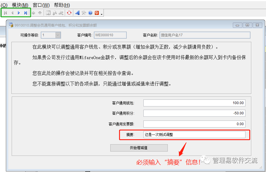 注:您的调整记录会产生“余额变动通知”并立即发送给调整了余额的会员。且会员方可以看到您输入的摘要